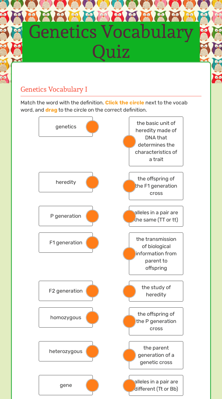 Genetic Vocabulary Worksheet : 2 Do Now Intro Genetic Definitions 1 Name Pd Date Genetics Vocabulary Matching Directions Match The Vocabulary On The Left With The Correct Course Hero :. Genetics is the study of heredity, or the way that traits (our physical characteristics) are passed from one . The study of how traits are passed from one generation to the next. Use the following terms to complete each sentence: Genetics vocabulary · allele — alternative forms of a gene for each variation of a trait of an organism · crossing over — exchange of genetic material between non . Genes, codominance, incomplete dominance, traits, and allele.